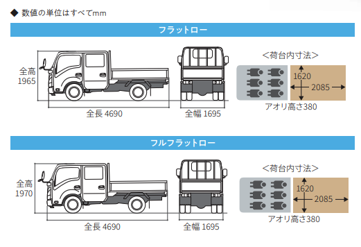 荷台高さとタイヤの仕様で3種設定されています。シングルタイヤだと2台高さ800mm超えますが