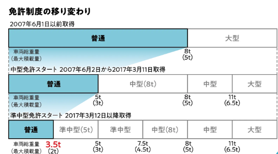 現在は総重量3.5トン未満、積載2トンとなっており、近年免許を取得したドライバーが運転できるよう