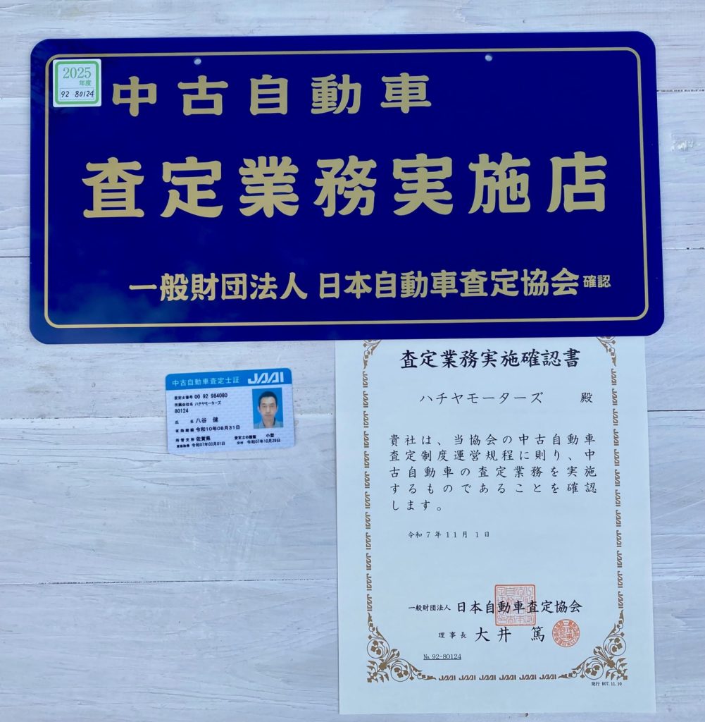 合格すれば取得できます。査定士資格は店舗に付与されるためハチヤモーターズとして