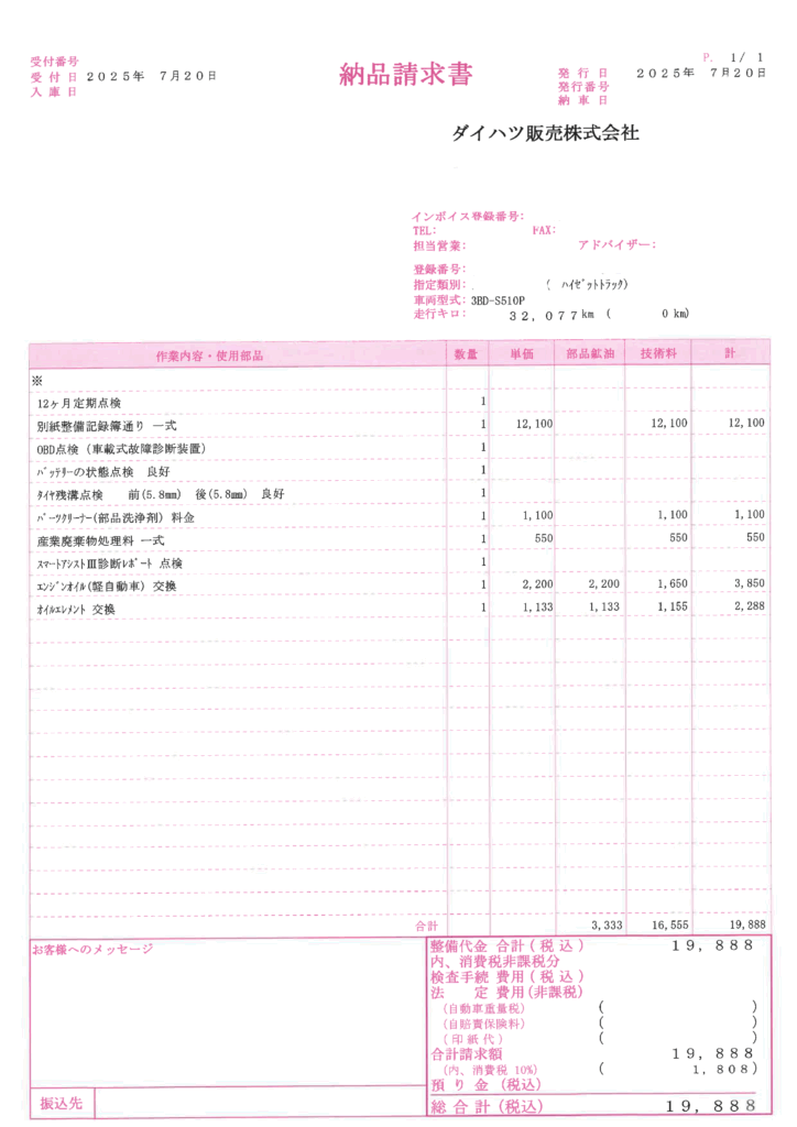 洗車は控えたいとのことでしたので洗車なしの12ヶ月点検をお願いしたところ